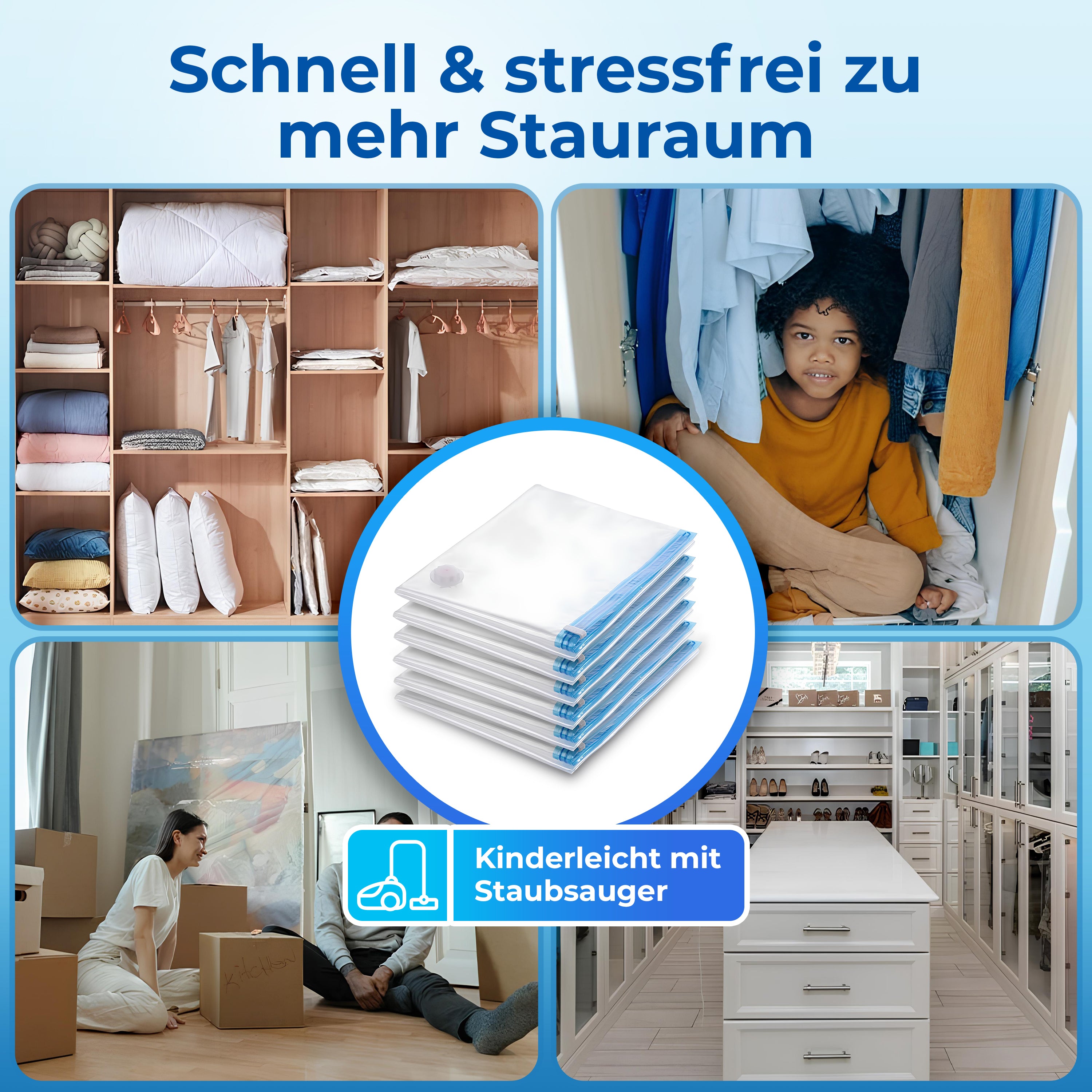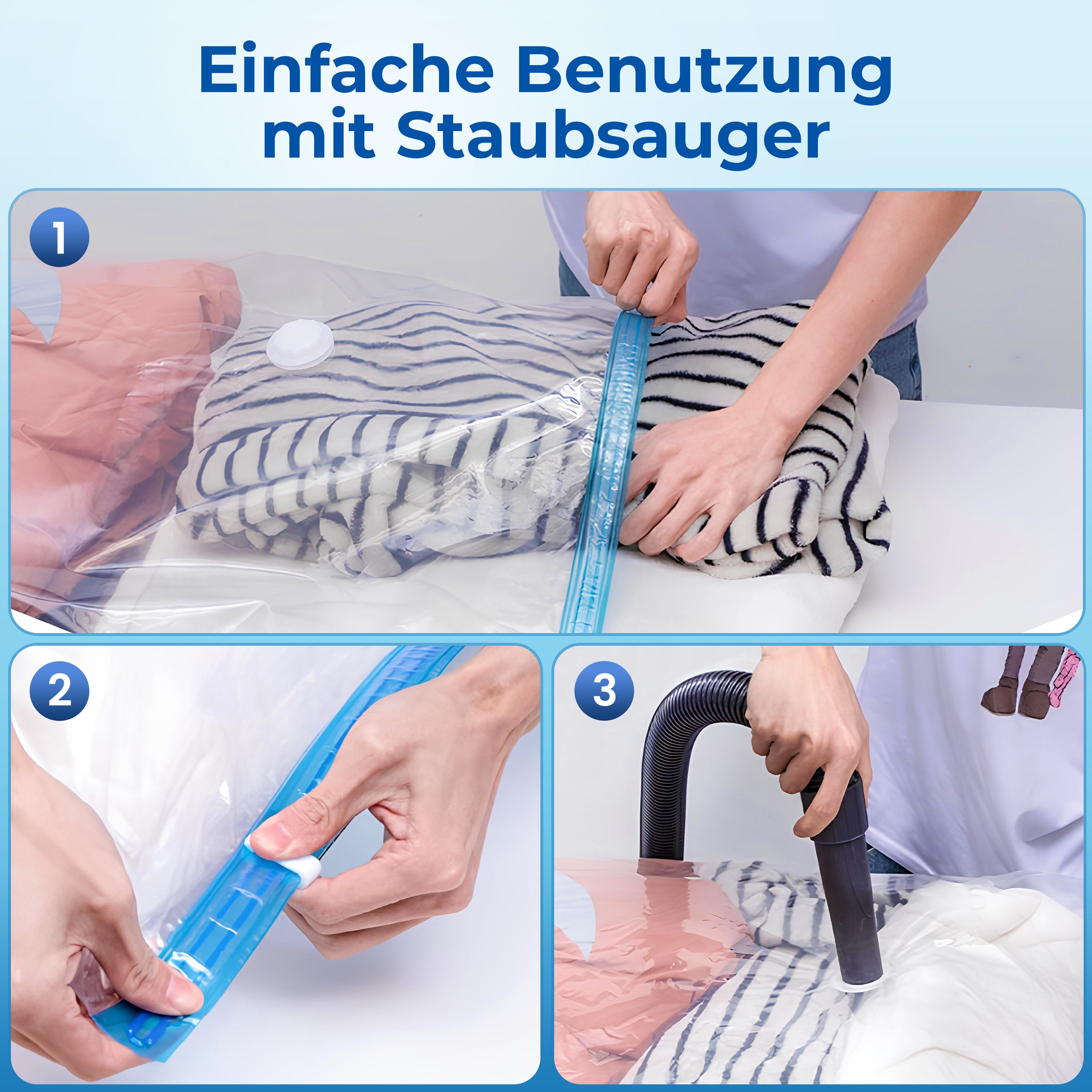 Besonders bei großen Textilien wird der Stauraum oft knapp. Komprimiere Kleidung und Heimtextilien um bis zu 80% – mit minimalem Aufwand! Das Resultat? Mehr Ordnung und Platz im Haus! Der Clou: Ein handelsüblicher Staubsauger genügt, um die Beutel luftdicht zu versiegeln.