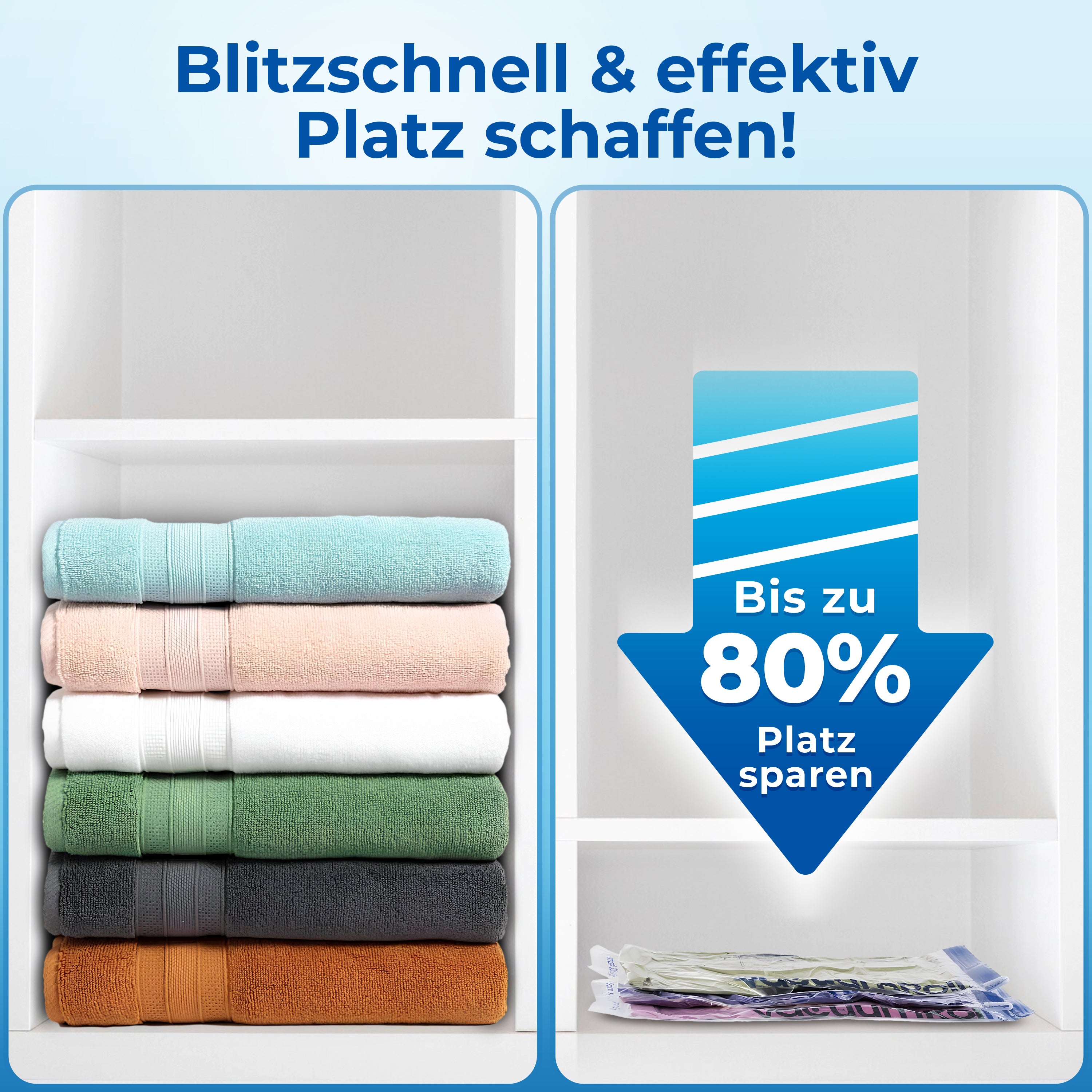 🚀 Spare bis zu 80% Platz: Reduziere das Volumen deiner Textilien um bis zu 80% und schaffe wertvollen Stauraum in Schränken, im Regal oder unter dem Bett.