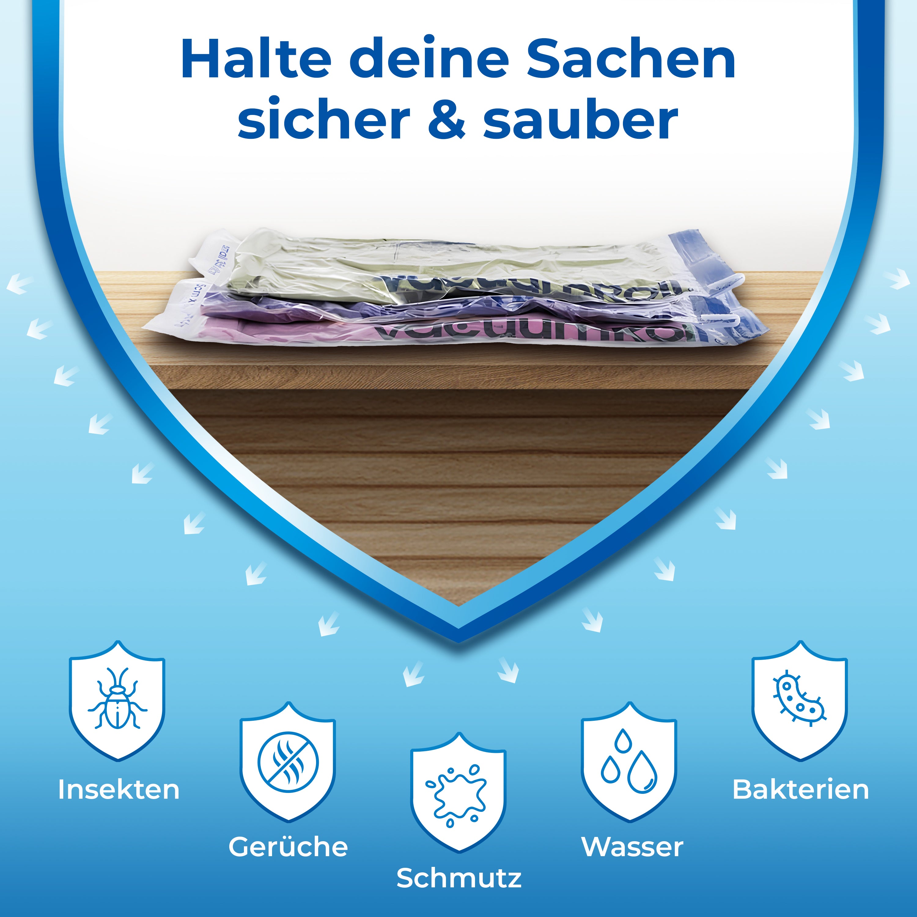 Durch die Nutzung der Vakuumbeutel kannst du deine Textilien, Decken und Kissen um bis zu 80% komprimieren. Das schafft nicht nur mehr Platz in deinem Zuhause, sondern schützt deine Sachen auch vor Staub, Feuchtigkeit und Gerüchen.